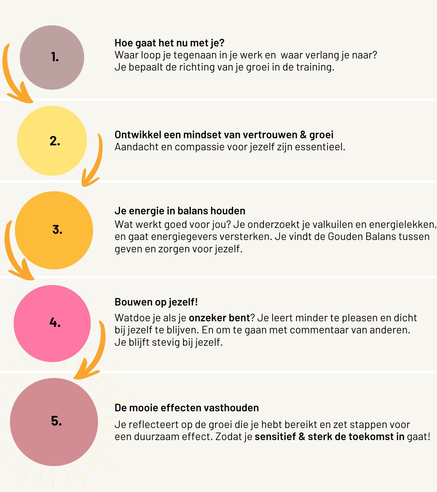 Tijdens de training ‘HSP & Sterk op je Werk’ doorloop je 5 stappen, elk bestaand uit diverse lessen.