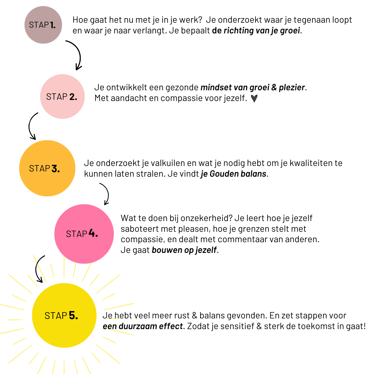 Tijdens de training Sensitief & Sterk op je Werk doorloop je 5 stappen of modules, elk bestaand uit diverse lessen.